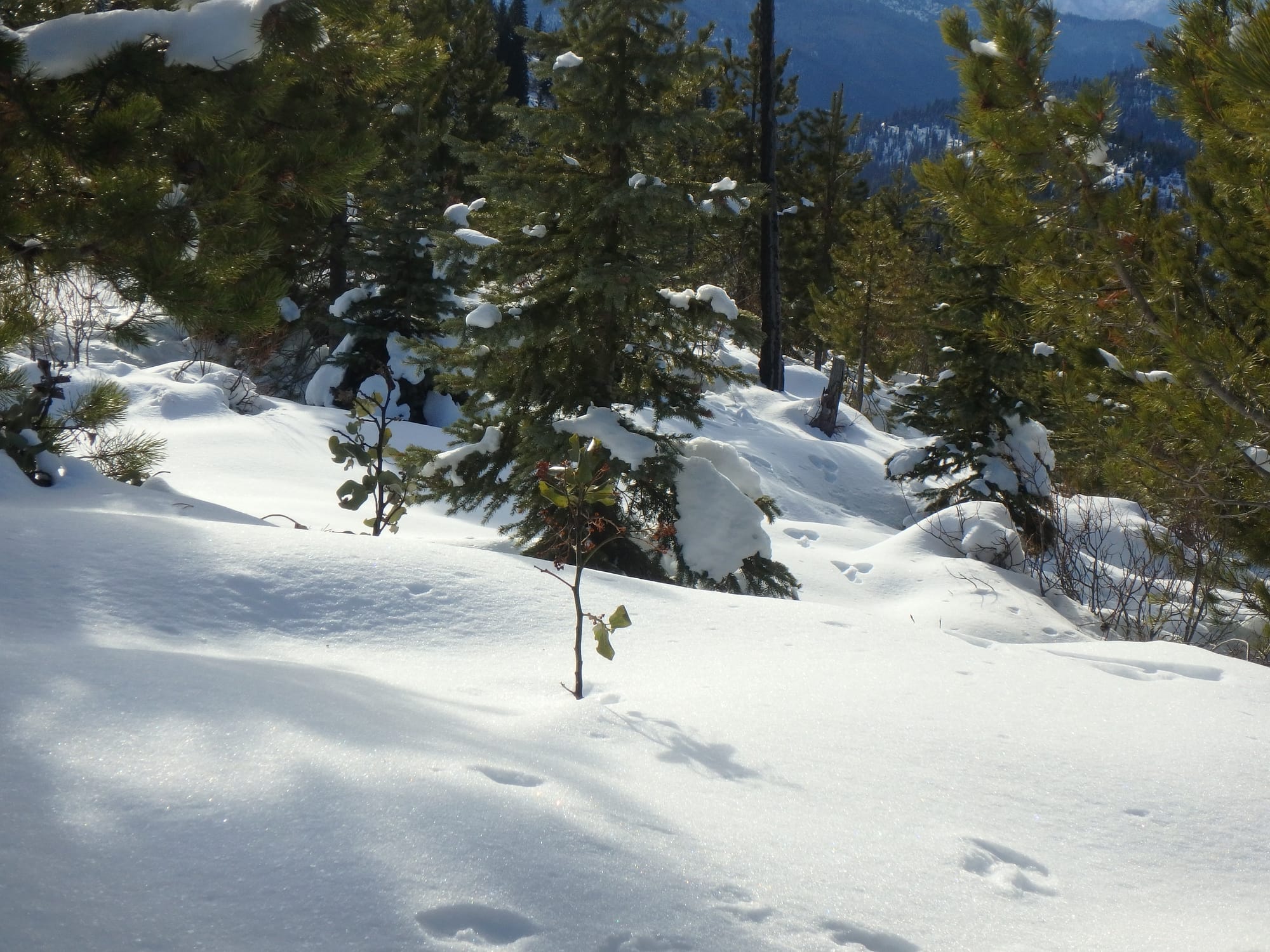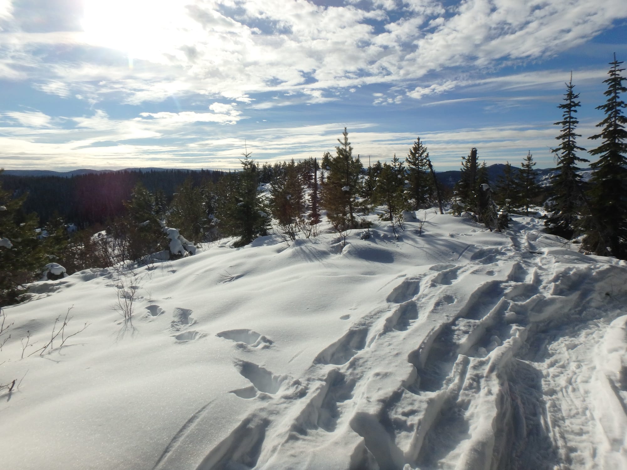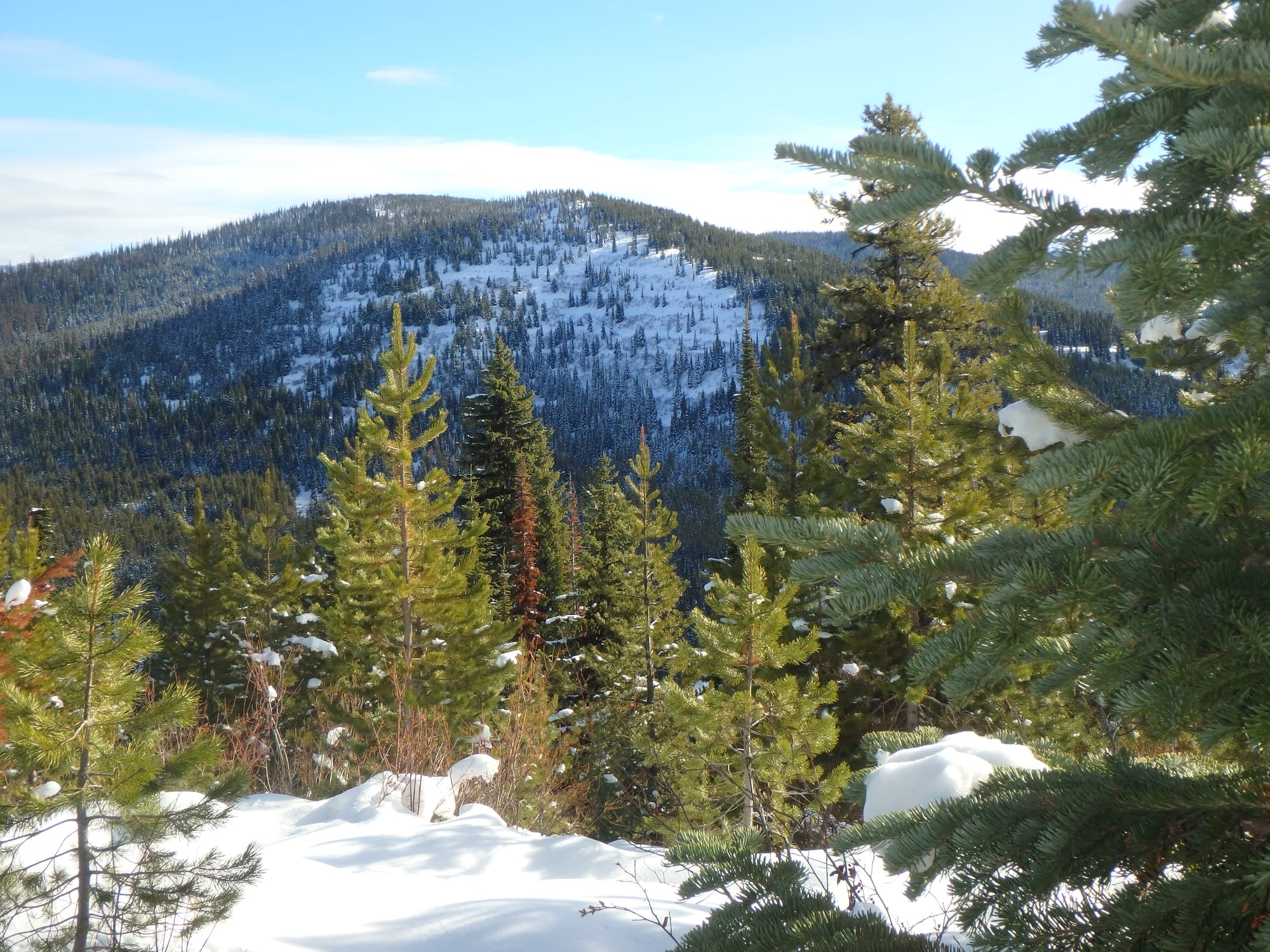 It was Thanksgiving weekend, there were folks who wanted to go but had other obligations, so it was just David and I. We had been up to Lolo Pass on Fri, and found nice skiing that was deteriorating with the warm sunny days. Anticipating that after yet another day of warm sunny conditions that the skiing would be more iffy, we chose to snowshoe. It was yet another warm sunny day, and we snowshoed on the snowshoe trail, up Pack Ridge, the ridge between Pack Cr. Rd. and Hwy 12. It’s exactly 1 mile/1.61k to the Pack Ridge summit, about 400 ft/121.92m (5200 to 5600ft/1584.96m - 1706.88m) up. Most of the 400 ft/121.92 is gained in about 2/3 of a mile/1.06k on the east/north side of the ridge, above the Lolo Pass Visitor’s center. At the bottom are two trails, one that stays low and goes 1/2 mile/0.80k to the Pack Cr. Rd., and the one that goes up. It’s one of those trails that is steepest at the bottom and gets less steep as you go up. We were following a well defined track and trail markers. I have bails on the back of my snowshoes that can be put up as a heel support and makes climbing steep terrain more like plain walking. Used them, but a little tricky in the few “down hill” sections of the trail. Just below the summit ridge there is a road to cross, then follow the ridge top undulations to the summit. Great views down the Hwy 12 corridor in Idaho, across to Wendover Ridge, and the hills that make the part of the ski area across Hwy 12. To the south we could see down the back of the Bitterroots, St. Joseph, Heavenly Twins, St. Marys and Ranger Peak. Directly across Pack Cr. was Mt. Fuji, with the stair step roads down its northeast flank that are a 1970’s clear cut that failed to recover, even 50 years later. We had some lunch and started down.We came off the west side of the summit mound and were trying to figure out the best way down, without going down what we had come up. We faced a dilemma that we’ve had everything we’ve come off of Pack Ridge, not being sure exactly where the snowshoe trail goes. There is a trail marker at the summit, and I’s swear in the past we had seen trail markers down where we were, but not the last few times we had come off this way. Wondered if the “official trail” went back down to the road we had crossed and continued down from there. In the saddle just below the summit mound was an old road that we knew would lead us down into some terrain we really didn’t want to be in, though some snowshoe tracks went down that way. And, every time we went that way we did eventually end up on the return trail, way down. Today we followed snowshoe tracks around a knob just to the west of the summit, as I knew that the terrain below that next saddle was more gentle than below the first. The snow was weird, at the heat of the day we could see the sun turning it to corn snow, but the very top layer remained dry and loose and slid when we went down even short slopes, sometimes I just dropped down and slid down on a thigh for a few feet. In the shade it was light and powdery. We followed the snowshoe tracks down like the first 100 ft/30.48m and they lead into a small clearing, in big trees, on the edge of a drop off. There they stopped, they must have turned around and went back up. All over the ridge we had been seeing old -blown over, filled in- moose tracks. Some lead out of this clearing down through the trees and we followed them until they went into some dense trees where we didn’t want to go. Instead we strung together some “snow ramps” through the trees, in places following big cat tracks. Eventually we came to another drop off, down through alder brush. David went down first and ended up in a hole.There were two small trees placed so it seemed like he should be able to pull himself up on them, but they just bent. Eventually, he got maneuvered around so he could get his snowshoes off and cradled out. I dropped down, careful to keep my snowshoes on the alder branches, and out of the hole, but he still, had to help pull me back up on my feet. From there I crossed over a small open bowl, tracking above some alder brush, across to the other side of the bowl where I though I could see snowshoe tracks. David avoided that and went lower and rejoined me by the tracks which proved to be more moose tracks. They provided us with enough break in the snow surface to make going down easier. Then we encountered a snowboard track, followed it down a bit more until it went over an edge. We crossed another gully and working down it negotiated another drop and found ourselves in not much snow, beneath large trees, and picked our way down to a last drop before coming out on Pack Cr. Rd. We were about 1/4 mile/0.40k from where the lower snowshoe trail crosses Pack Cr. Rd. and we followed it back to the Visitors’ Center. Where the trail crosses Pack Cr. Rd. we saw some people, but other than that, we encountered no other people on our journey. We went only a bit over 2 1/2 miles/4.02k but got in all the good stuff: stiff climb, summit views, off trail wandering, snow wallowing and challenging route finding. It was a nice, beautiful day.
