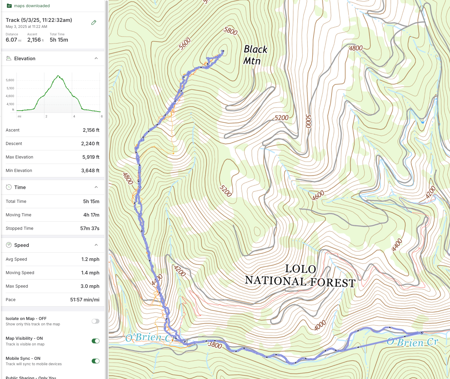 On a fine spring day we met at the O'Brien Creek Trailhead. The actual Trailhead has very limited parking so we piled into one car at the O'Brien Trailhead and carpooled the last two rough miles up creek, past the scary Angels, to the gate and parked. The first mile or so was an easy stroll up a jeep trail that follows the creek. Then the off trail fun began. After about two miles, two hours, 2000 vertical, lots of wildflowers and just about as many ticks we were at the top of Black Mountain (5951'). At the peak we took the usual trophy photos and had a tick count contest, which Taryn won easily, then we headed down the way we came. Took about 6:15 at our unhurried pace. Got back in plenty of time to head to the TRM Spring Fling BBQ! Tom Statz