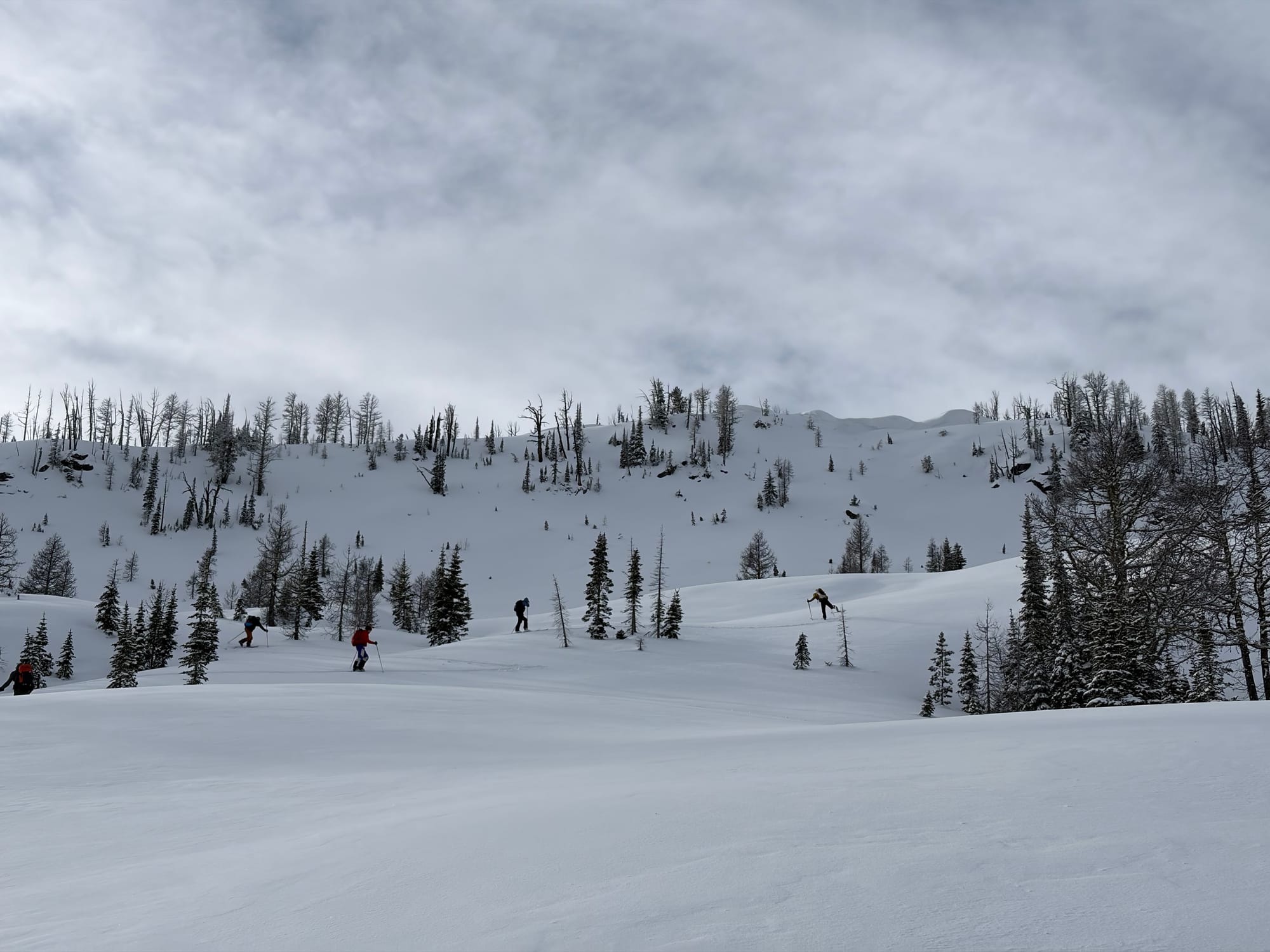 From the pit we continued our climb up the bowl to ~8000’ at which point most of the crew transitioned to downhill mode. A few of us went for a few hundred more bonus-vert and transitioned just a bit shy of the ridge line. The descent started around 2:30pm, which by perfect coincidence had been our pre-established turn-around time. We made fun turns all the way down the bowl in moderately dense but nicely consistent powder. From the bottom of the bowl, we switched to survival skiing mode to traverse the lower ridge that connected us back to the summer trail and made it partly down the trail before transitioning back to foot travel a short ways above the upper trailhead.