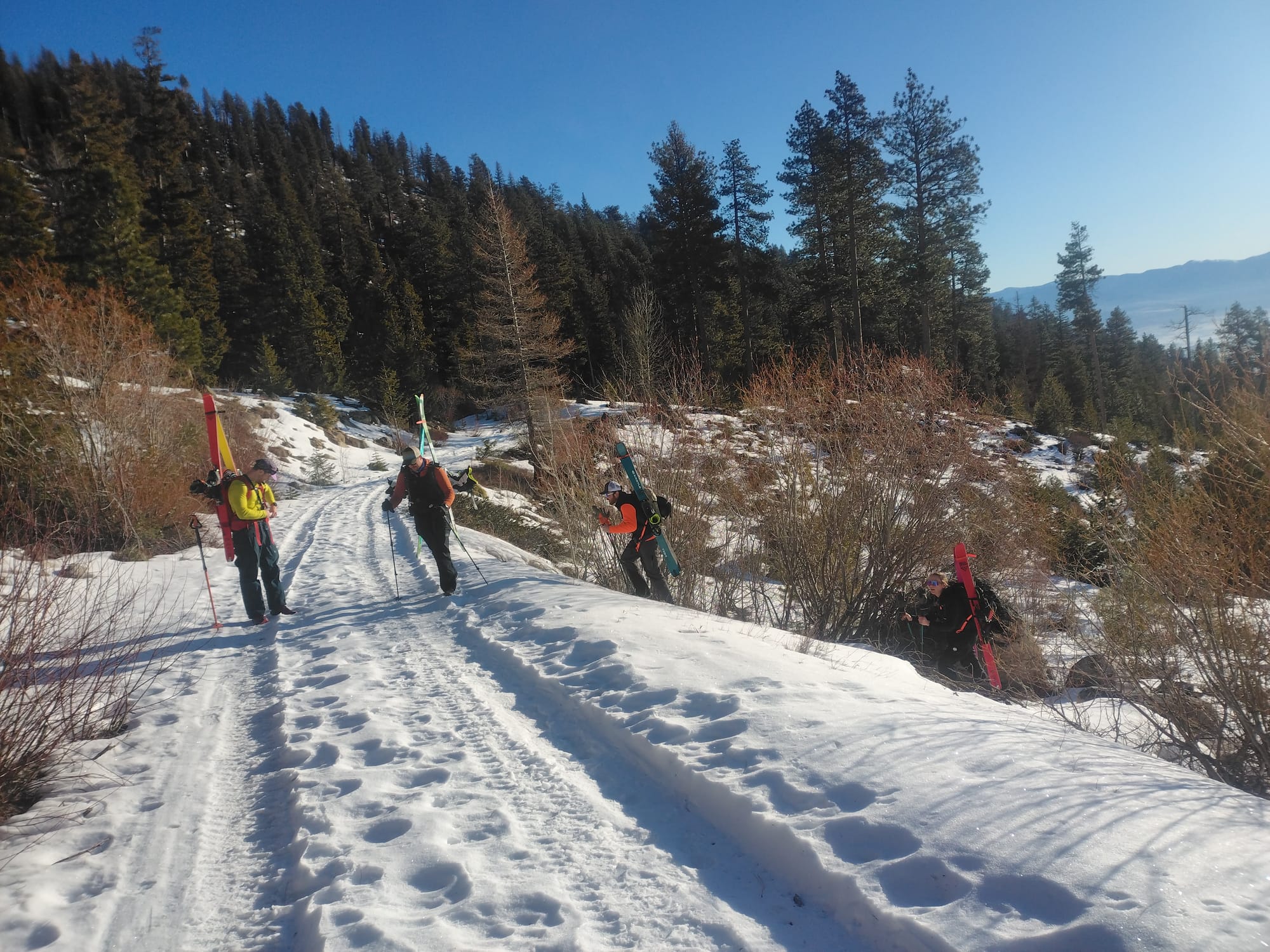 After loading into two vehicles, we headed down the valley to the trailhead. With a surprising level of efficiency, packs were shouldered and skis sorted, and we were on the trail by 9:00 a.m. The receding snowline meant a longer bootpack than on our trip two weeks prior, with skis finally going on around 6,000 feet. While spirits dipped briefly as we joked about the mid-January “spring” conditions, the prospect of early-season corn kept morale high.