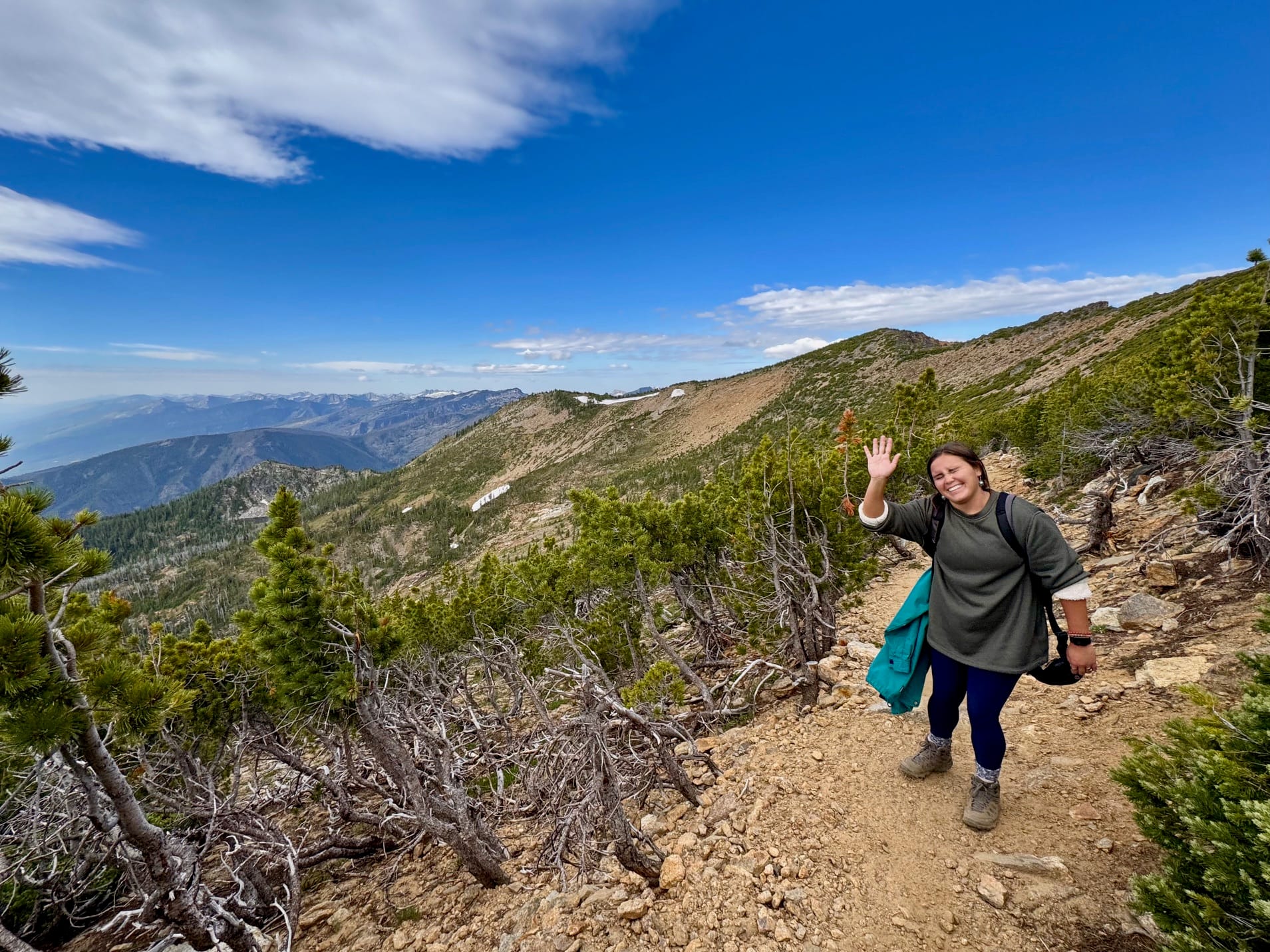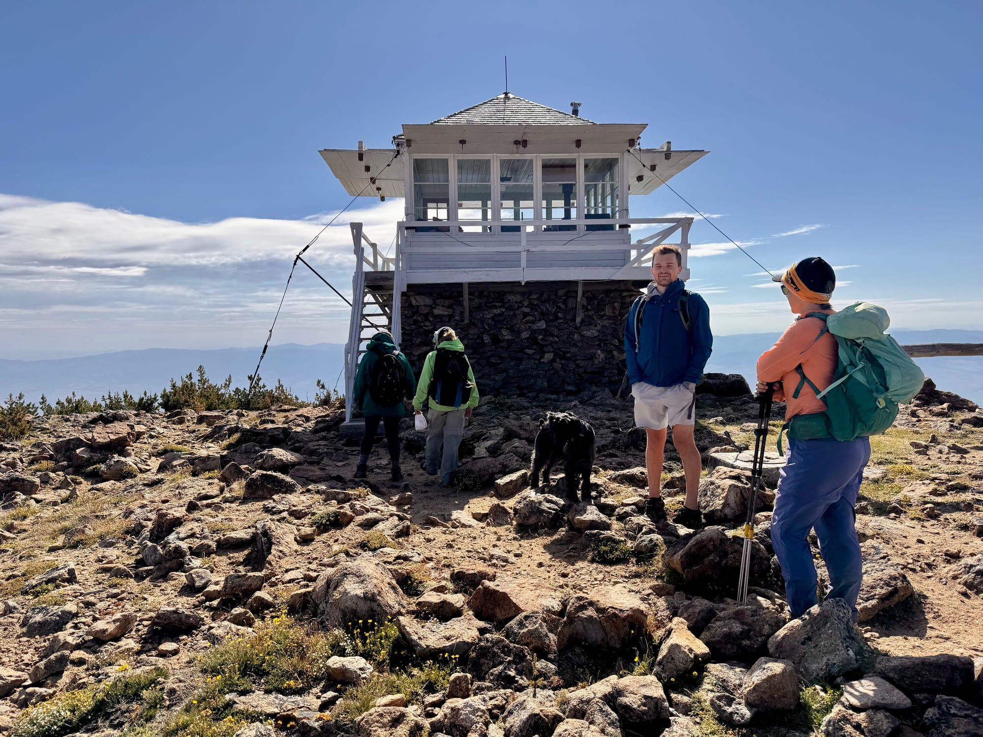 Last Saturday, six of us gathered for a hike up St. Mary Peak in the Bitterroot Mountains. At the trailhead, we split into two groups to accommodate different paces. With high winds forecasted at the summit, we planned for an early start and hit the trail at 7:30 AM. Despite the hike's popularity, the parking lot was surprisingly empty when we arrived. We welcomed a new member to the group, Hannah, a visitor from out of town. It was her first time hiking at a higher elevation, and she handled it admirably. As we approached the tree line, the wind picked up noticeably, and temperatures began to drop. We paused to add extra layers before continuing upward. Yes, it was cold! At the summit, some of us explored the fire lookout tower while braving the howling wind and chilly conditions. We enjoyed a quick lunch, soaked in the stunning views, and began our descent. By the time we returned, the parking lot was full. It was about 12:15 PM. There, we met Sheryl Olsen from Stevensville, a dedicated trail advocate and volunteer who provides water to hikers in need. She shared stories about unprepared individuals attempting to hike some without water, proper clothes, or even wearing flip-flops.