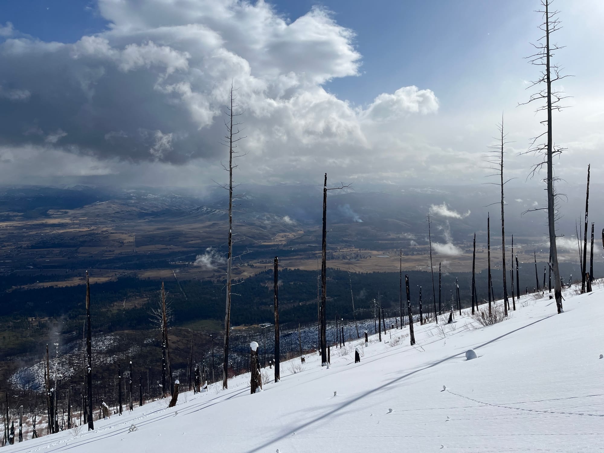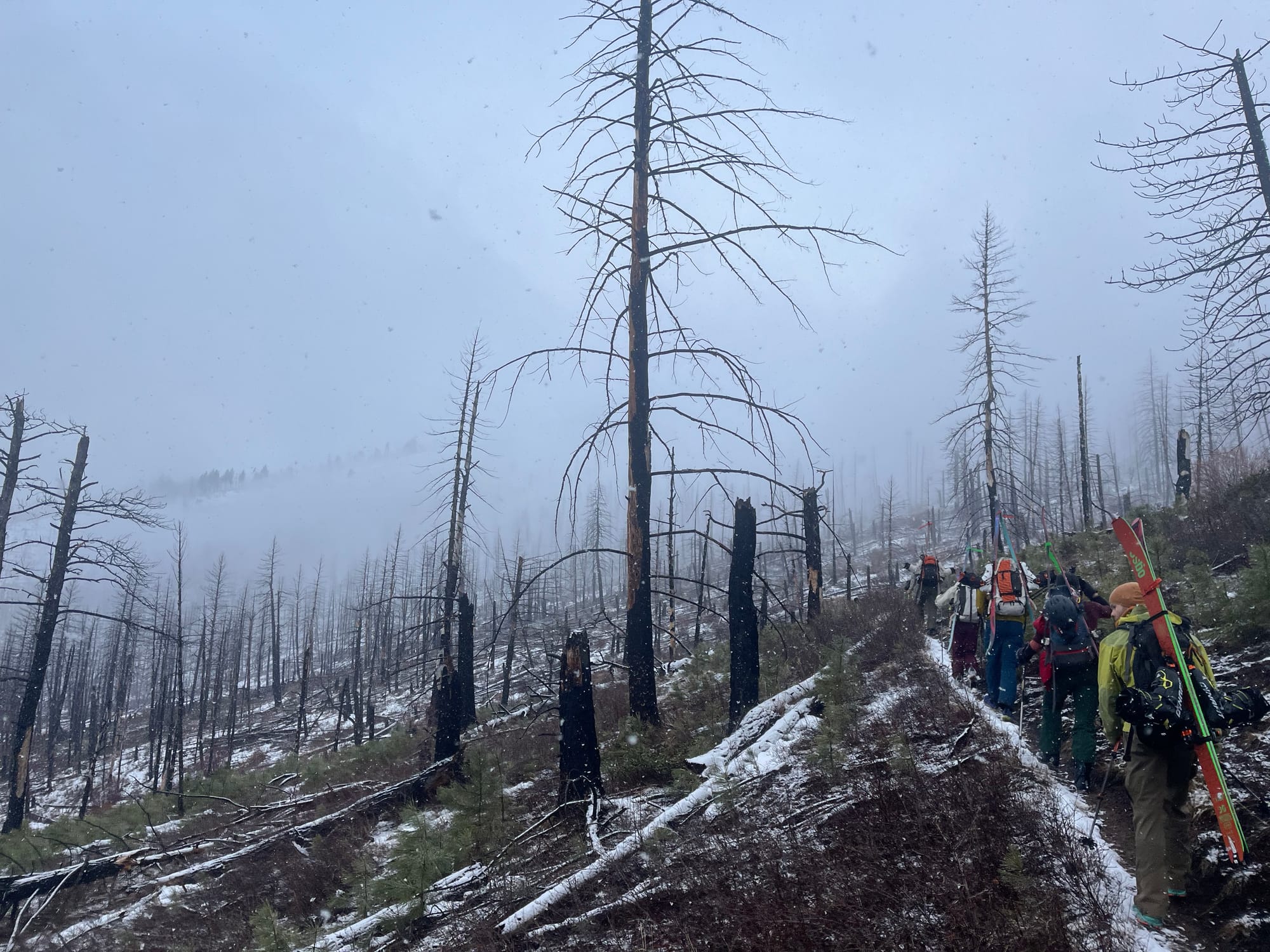 With a bit of winter finally showing up, a crew of us decided to see what conditions looked like down the Bitterroot and give Ward Mountain a go. We set off on the summer trail around 8:30 with an intermittent light misting, but not the full-on rain I was worried we might have. After some hiking, we were able to put the skis on around 5600’ and start skinning up through the old burn area. The snowpack quickly piled up and optimism for good skiing grew and grew the higher we went, and the sun even burnt through the clouds to give us a bit of light for an hour or two.