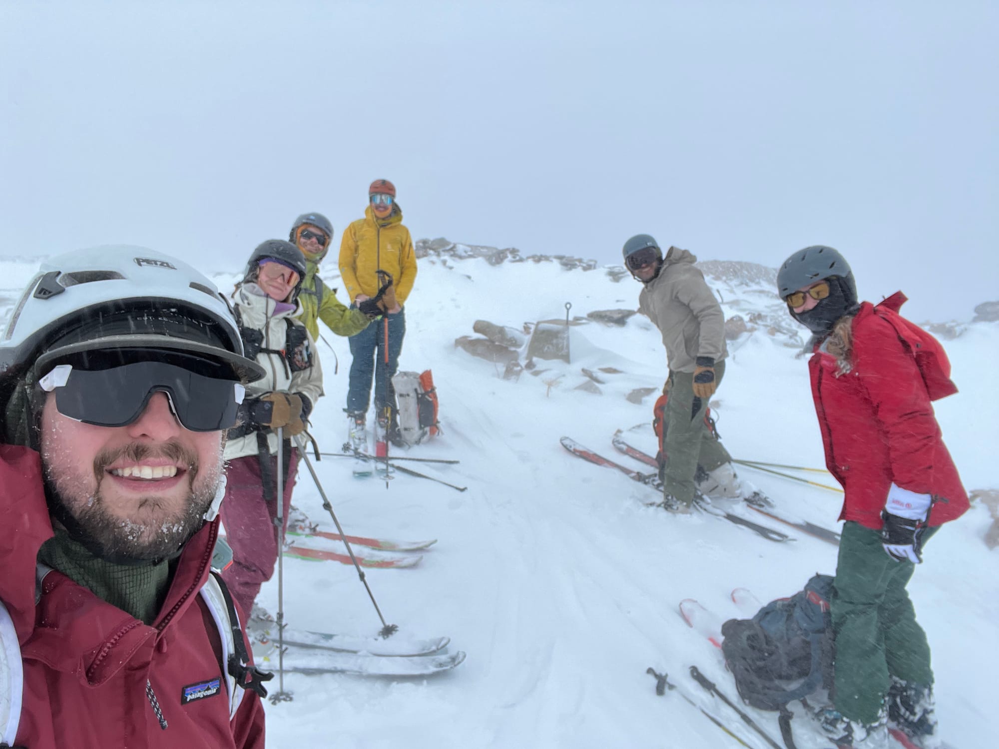 Near the top we ascended into the clouds and were met with the usual strong ridge-line winds. We trudged on to tag the summit just before 2pm. Not a day to hang around the top though, so we snapped a quick summit selfie and skinned back to a slightly more protected area to transition for the descent.